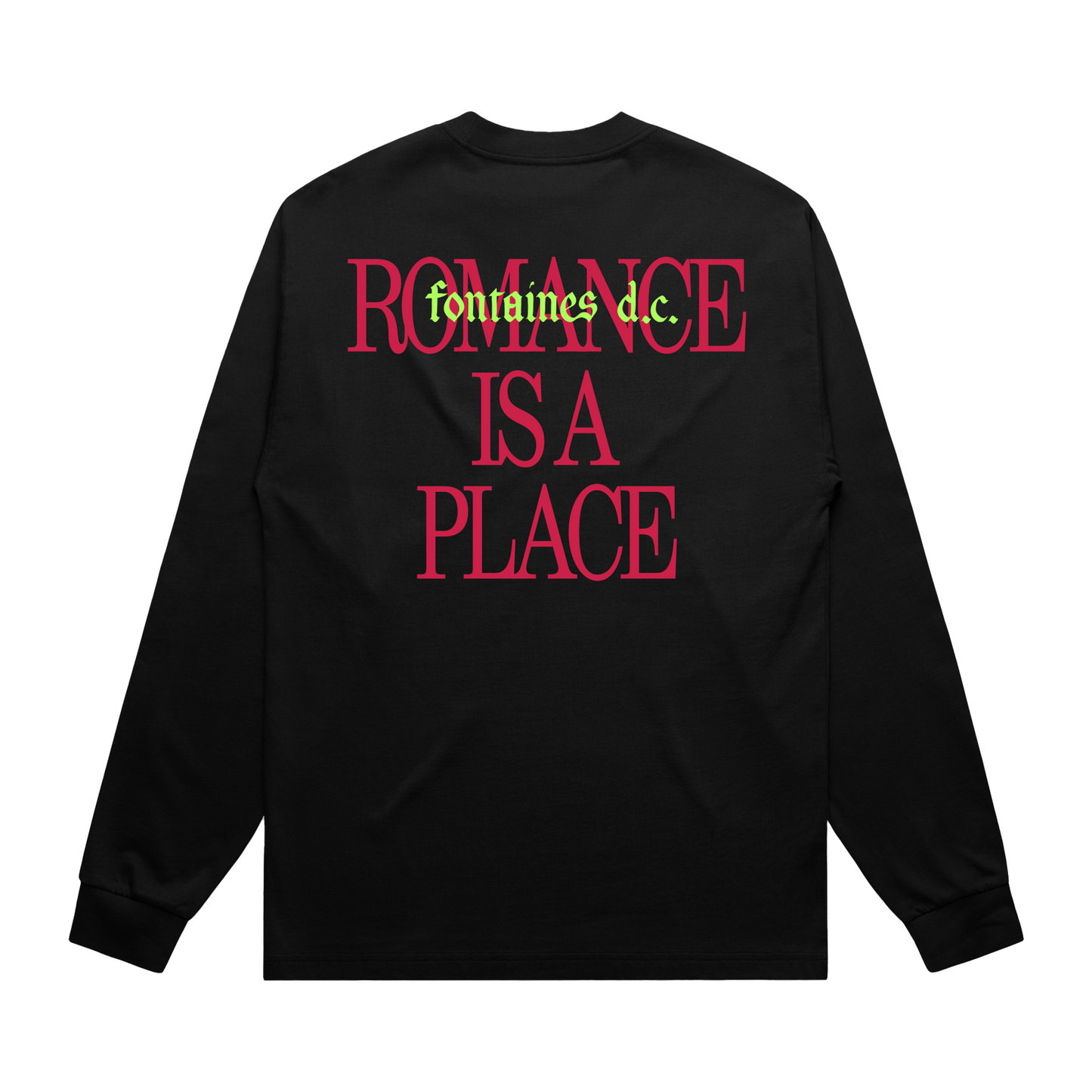 Black longsleeve shirt with 'Romance Is A Place' back print.